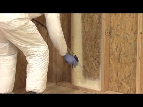 - Нанесите при помощи комплекта Touch'n Seal Foam Kit пенополиуретан на поверзность стен между направляющими из дерева или направляющими для гипсокартона. (Если высота направляющих больше планируемого слоя пенополиуретана, заполнять пространство целиком необязательно)
